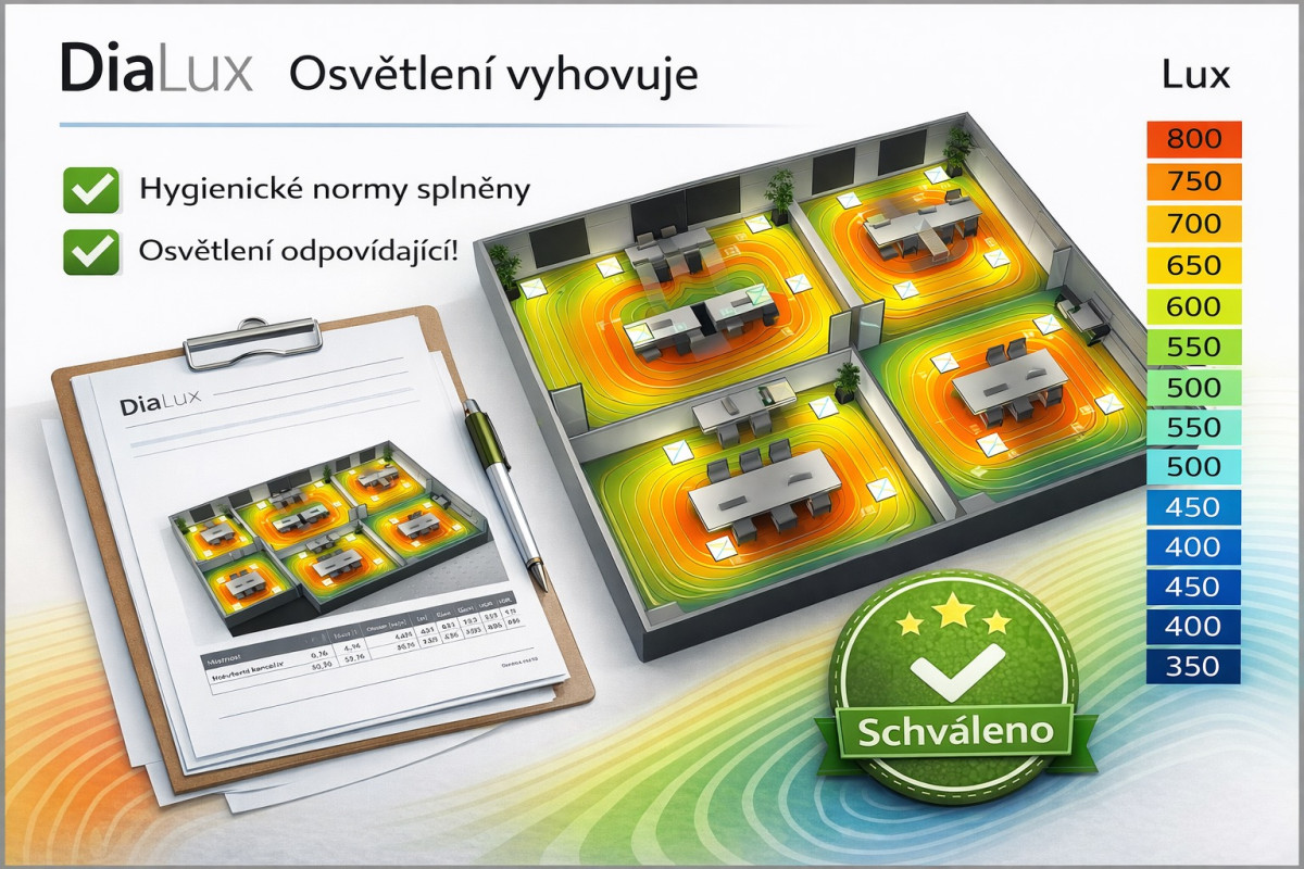 K návrhu od nás dostanete protokol elektrického osvětlení, který dokládá splnění požadavků normy ČSN EN 12464-1.