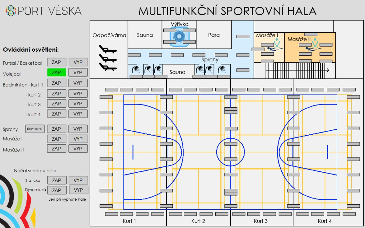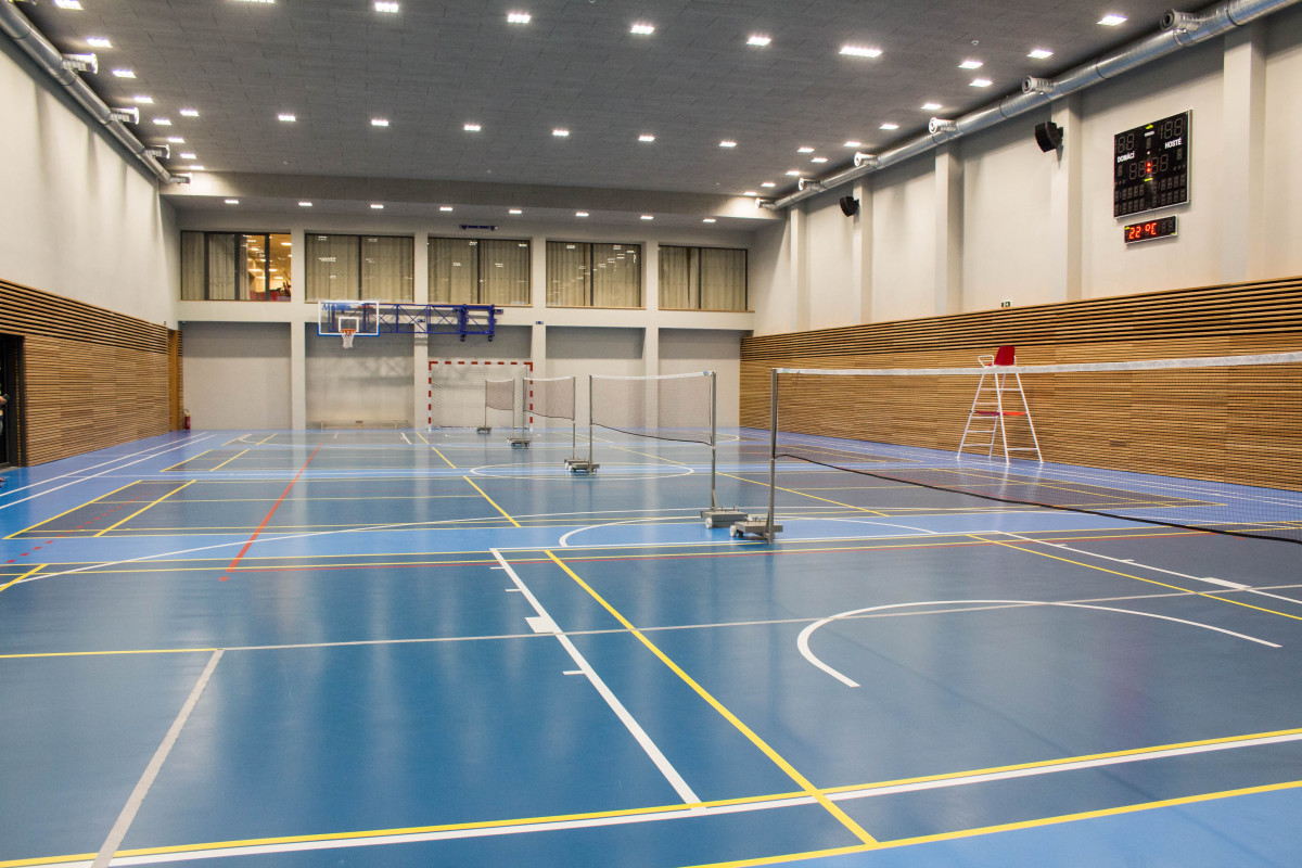 Zde nám byl svěřen úkol osvětlit víceúčelovou sportovní halu, která zahrnuje čtyři dvorce pro badminton, basketbal, sálový fotbal a volejbal.